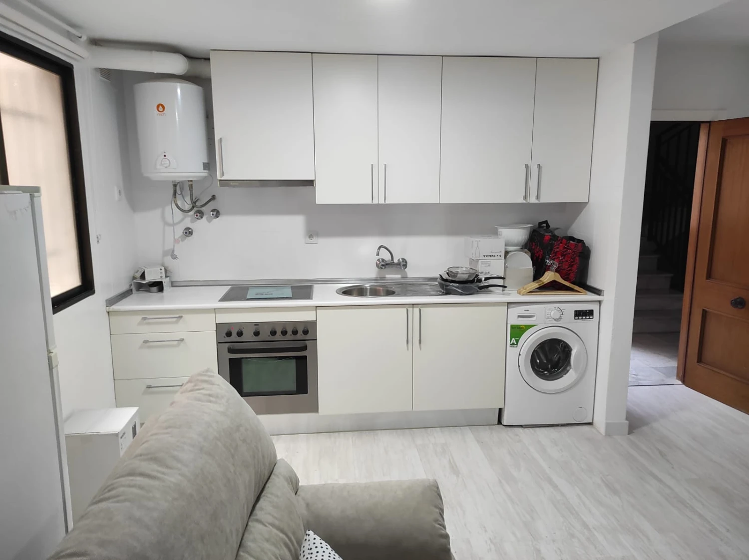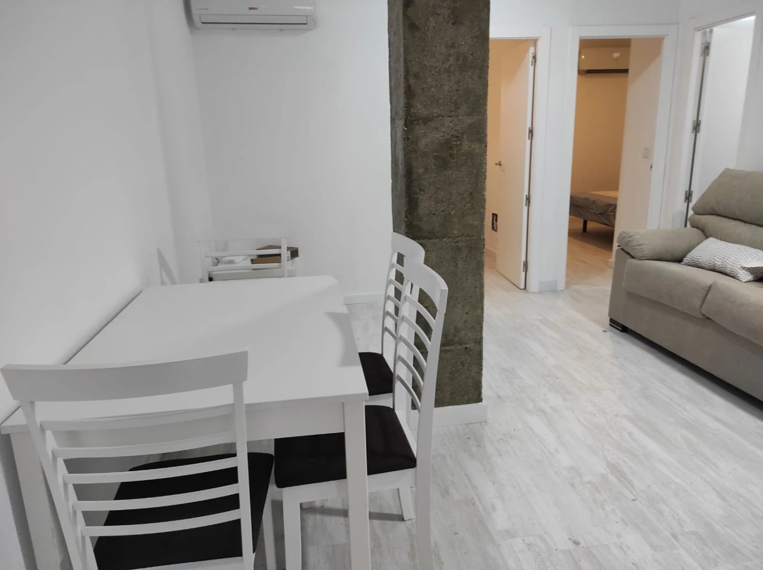 El piso se alquila amueblado, con cocina equipada con electrodomésticos, listo para entrar a vivir. El suelo de terrazo aporta carácter y fácil mantenimiento, mientras que el aire acondicionado garantiza confort durante todo el año.