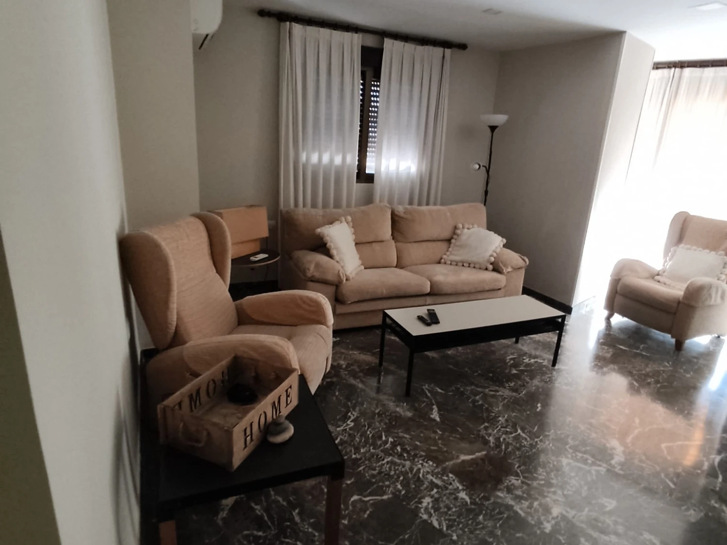 El salón, amplio y exterior, se conecta con una galería que aporta aún más luz natural. Para tu confort durante todo el año, la vivienda dispone de aire acondicionado.