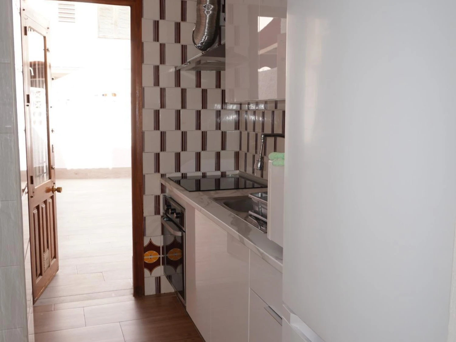 Al entrar, te recibe un luminoso salón-comedor climatizado con aire acondicionado y equipado con un ventilador de techo, donde podrás relajarte tras un día de playa. La cocina, moderna y práctica, viene completamente equipada: vitrocerámica, horno, microondas, nevera y todo el menaje necesario para preparar desde un desayuno tranquilo hasta una cena gourmet. Justo al lado, un aseo de cortesía evita esperas en las horas punta.