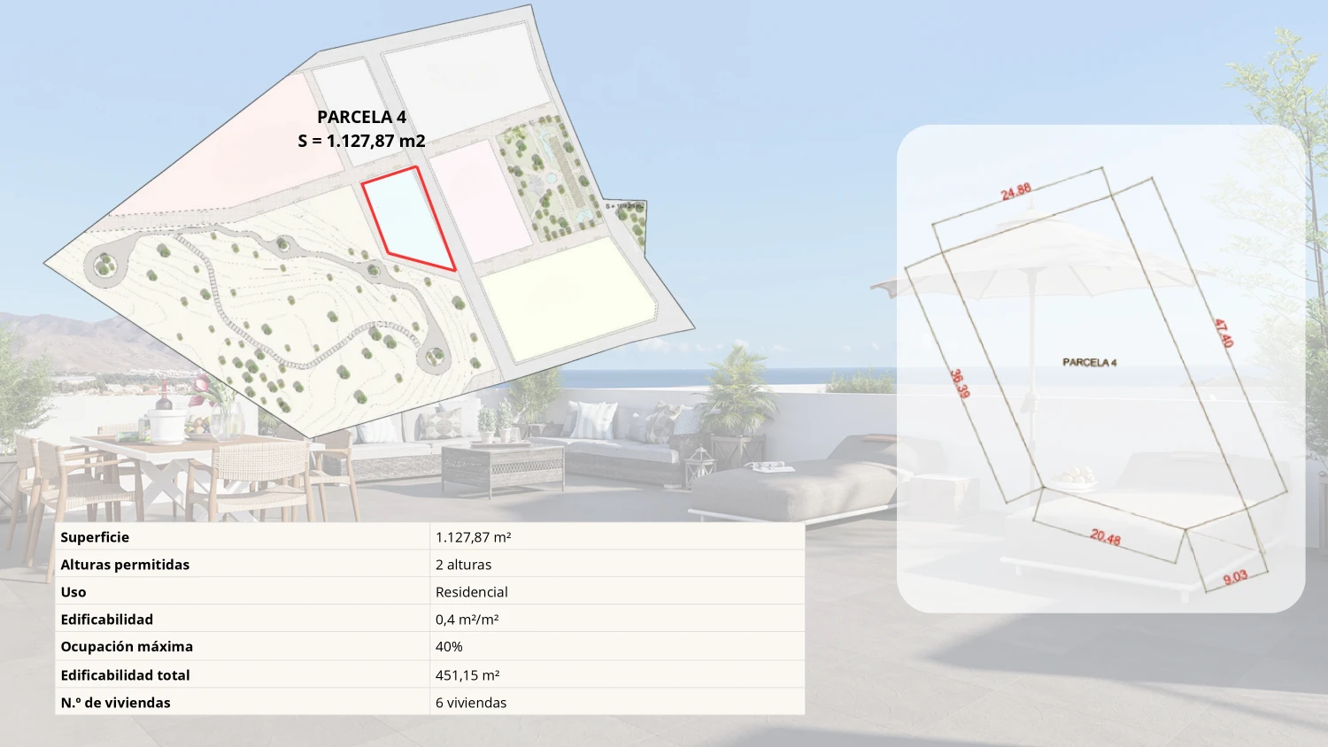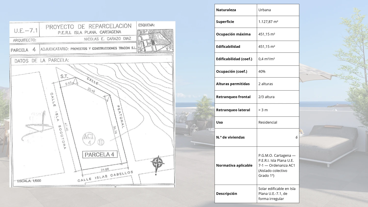 En conjunto, la parcela reúne condiciones urbanísticas claras y definidas para el desarrollo de un proyecto residencial acorde con el planeamiento, el entorno y la escala edificatoria de Isla Plana.